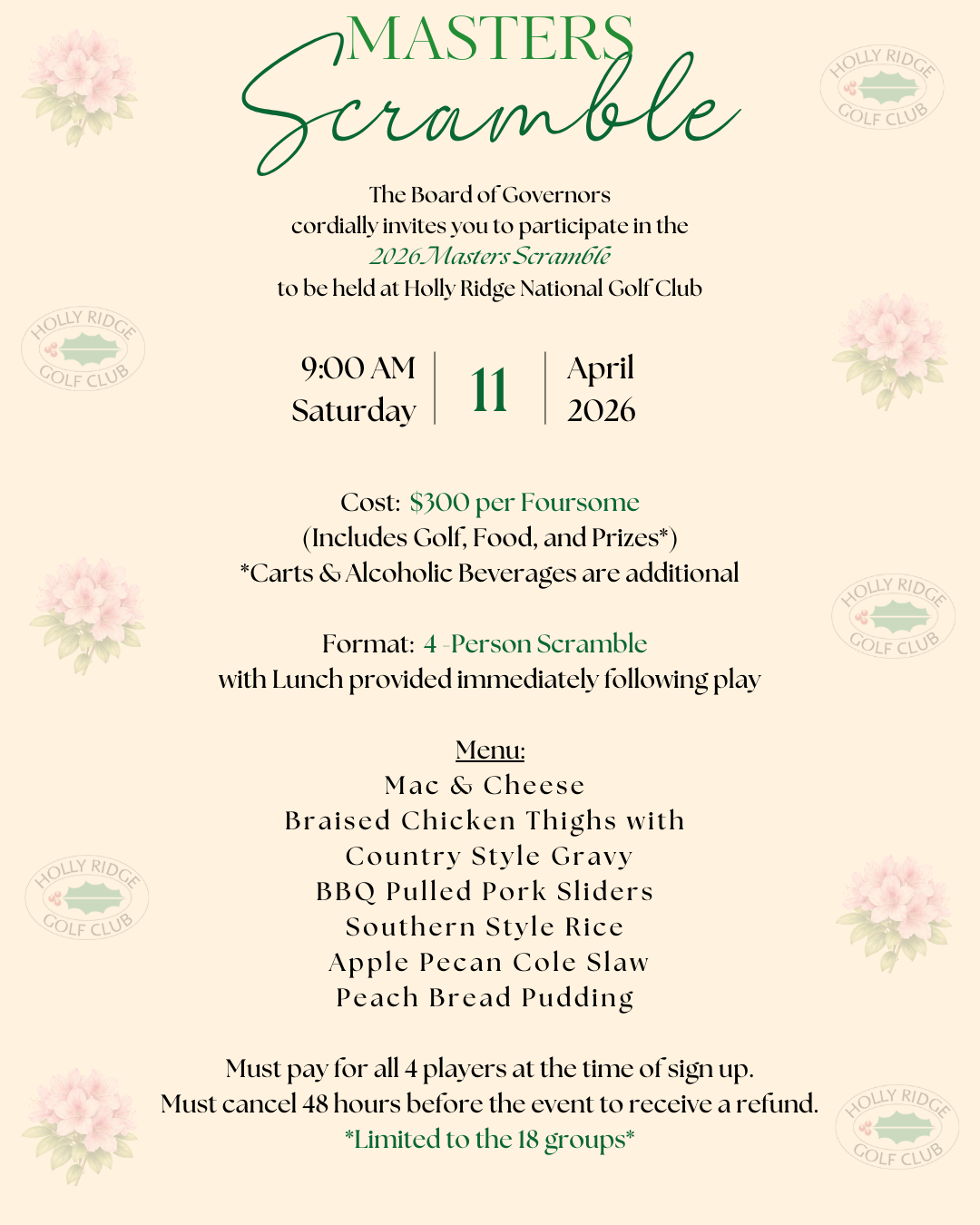 Must pay for All 4 Players and reserve carts (if riding) at time of sign up.